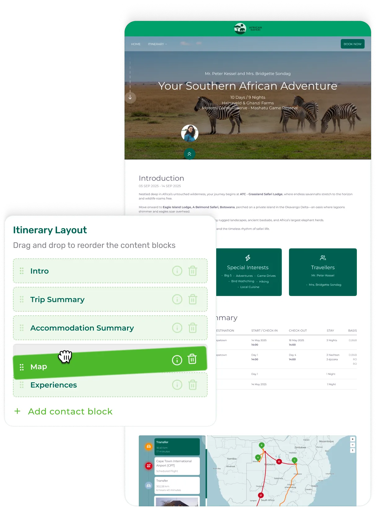 Work faster and smarter with Wetu’s Itinerary Builder and Content Management System, so you can spend more time building relationships that close bookings. Create beautiful, client-ready itineraries in minutes using custom themes, rich accommodation and destination content, translation options, and flexible branding.